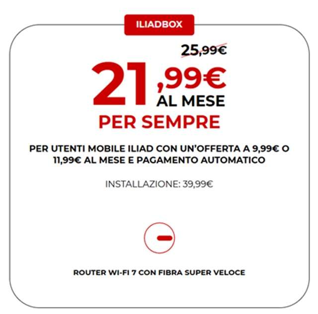 Tra le migliori scelte oggi disponibili figura la fibra di Iliad, in promozione a 21,99 euro al mese per sempre invece di 25,99 euro per tutti gli utenti mobile Iliad con un’offerta da 9,99 euro o 11,99 euro al mese e pagamento automatico attivo. Ogni anno, dunque, lo sconto è pari a 48 euro.