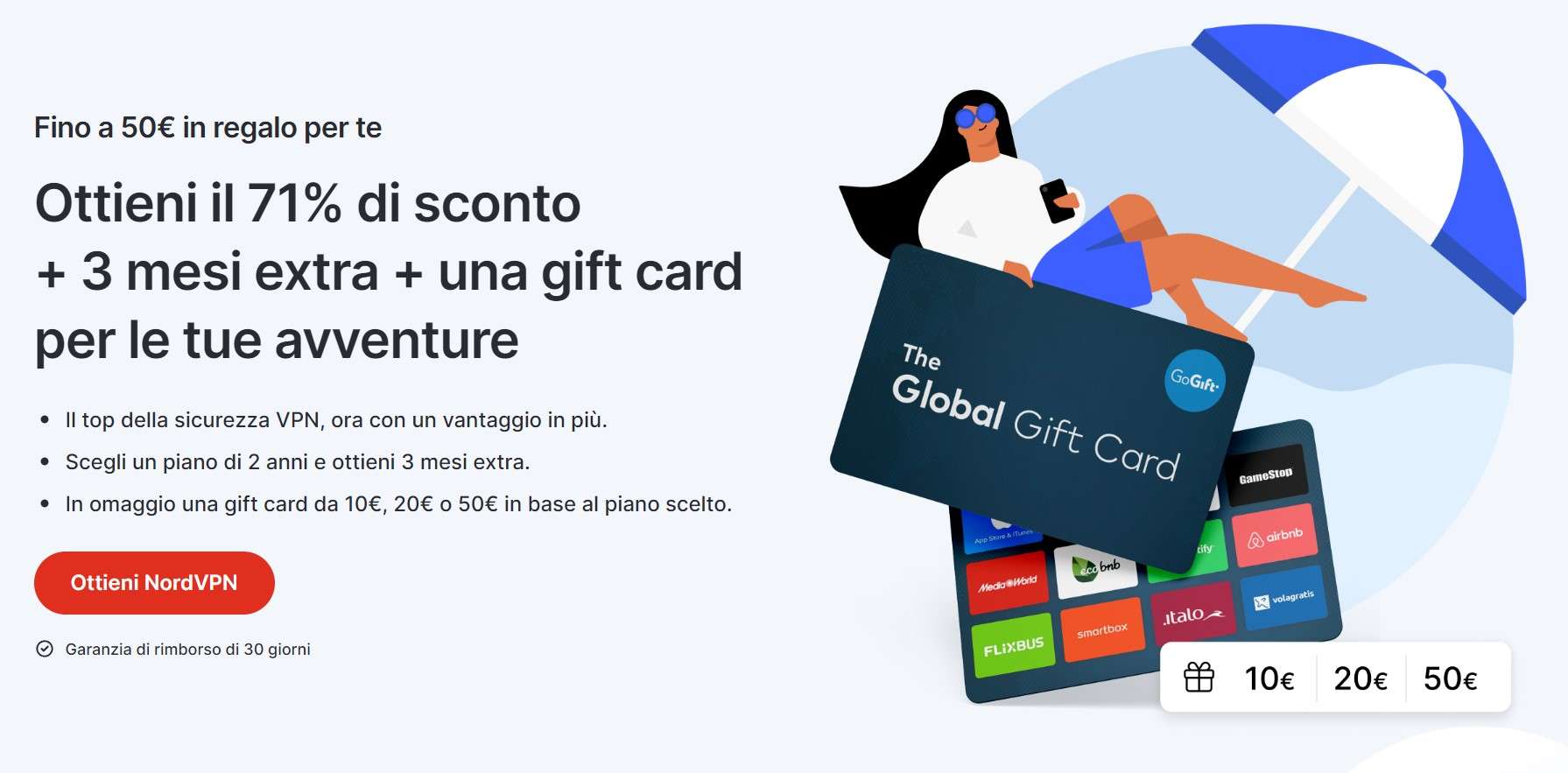 La nuova promo di NordVPN è da cogliere al volo: la migliore VPN sul mercato, infatti, è disponibile con uno sconto fino al 71% (in base alla versione scelta) e con una Gift Card in regalo fino a 50 euro (utilizzabile su Amazon e altri store online). L’accesso alla promozione è legato all’attivazione del piano biennale con garanzia di rimborso esercitabile entro 30 giorni.