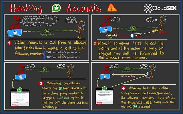 Come è possibile? Il numero in questione corrisponde a un servizio offerto dagli operatori locali Airtel e Jio. A sua volta, inoltra la chiamata a un altro numero controllato dai cybercriminali, che così hanno modo di avviare il processo finalizzato ad assumere il controllo dell’account. Questi selezionano l’opzione che permette di ricevere un codice OTP per concludere la registrazione finché la linea reale dell’utente è occupata (dunque mentre sta chiamando il numero fornito da chi esegue l’attacco). Troppo complesso? Ecco l’intera procedura riassunta in un fumetto condiviso su LinkedIn.