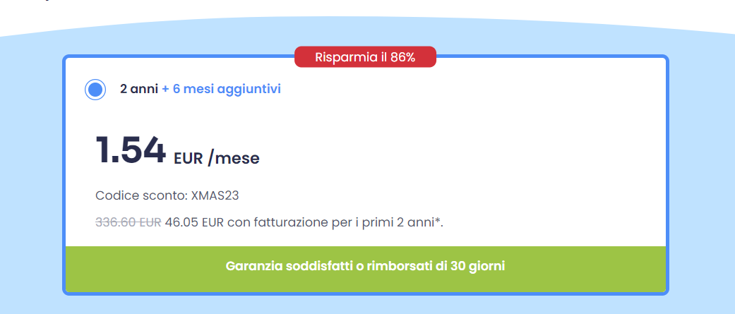 AtlasVPN prevede un costo di 1,54 euro al mese, grazie alla promozione di Natale. L’offerta in questione è accessibile puntando sul piano biennale con 6 mesi extra. In totale, quindi, ci sono 30 mesi di abbonamento a prezzo scontato. Per sfruttare l’offerta basta accedere al sito ufficiale di AtlasVPN tramite il link qui di sotto.