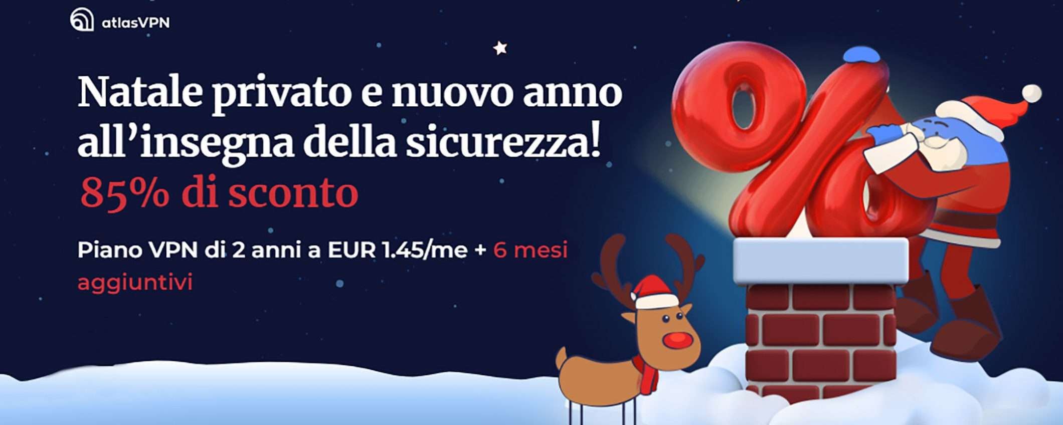 Il periodo prenatalizio è spesso accompagnato da sconti e promozioni e anche per chi cerca una nuova VPN c’è la possibilità di farsi un bel regalo di Natale grazie alla promozione di Atlas VPN. Durante questo periodo, infatti, è possibile attivare la VPN con uno sconto dell’85%.