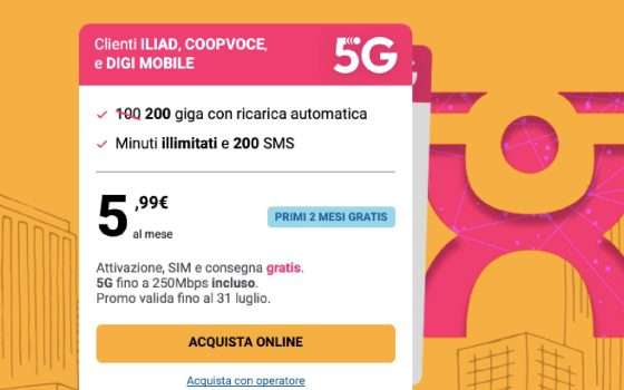 Per clienti ILIAD, COOPVOCE e DIGI MOBILE, è disponibile un piano da 100-200 GB con minuti illimitati e 200 SMS a soli 5,99€ al mese, con i primi 2 mesi gratis e attivazione, SIM e consegna incluse. Per chi preferisce soluzioni a lungo termine, è disponibile anche il pacchetto semestrale a 29,99€, con le stesse condizioni di navigazione e rinnovo ogni sei mesi. E non mancano le opzioni per chi ha bisogno di ancora più giga: fino a 450 GB mensili con piani che partono da 7,99€.