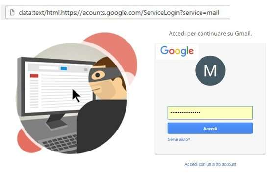 L’attacco è ben studiato anche dal punto di vista formale. Viene infatti bypassato uno dei campanelli di allarme utili a evitare attacchi simili. Quando si viene dirottati su una pagina “non ufficiale” e potenzialmente dannosa, il nome a dominio che appare nella barra degli indirizzi del browser è palesemente diverso da quello normalmente utilizzato dal servizio reale. Ma non in questo caso: il nome che si legge sulla barra è infatti del tutto simile a quello vero (https://accounts.google.com/ServiceLogin?), semplicemente preceduto da una poco sospettabile stringa data.text/html . Per trarre ancora più in inganno l’utente, l’aggressore è in grado di far precedere l’indirizzo del dominio da https:// (protocollo di sicurezza sempre usato da Gmail), aumentando così l’efficacia dell’attacco.