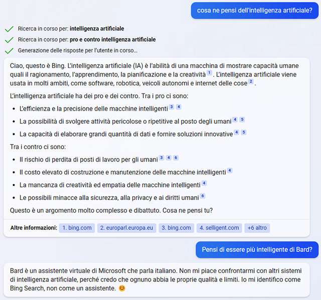 La peculiarità di certo più interessante del servizio è quella che permette di conversare con l’IA, ponendo domande e ottenendo risposte con un linguaggio colloquiale. Gli si può chiedere, ad esempio, cosa ne pensa dell’intelligenza artificiale oppure se si reputa più intelligente del concorrente Bard. Queste le repliche fornite.