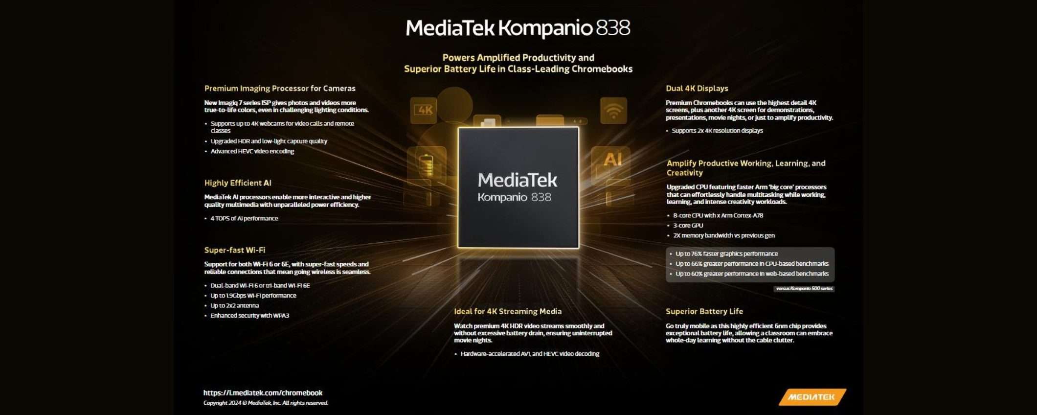 Il MediaTek Kompanio 838 è un chip octa-core realizzato con un processo produttivo a 6 nm, che garantisce un’efficienza energetica superiore rispetto ai precedenti chip a 7 nm rilasciati da MediaTek nel 2022. Grazie a questa caratteristica, i Chromebook equipaggiati con il Kompanio 838 potranno vantare una durata della batteria “per tutto il giorno“, permettendo agli utenti di lavorare o studiare senza preoccuparsi di rimanere senza energia.