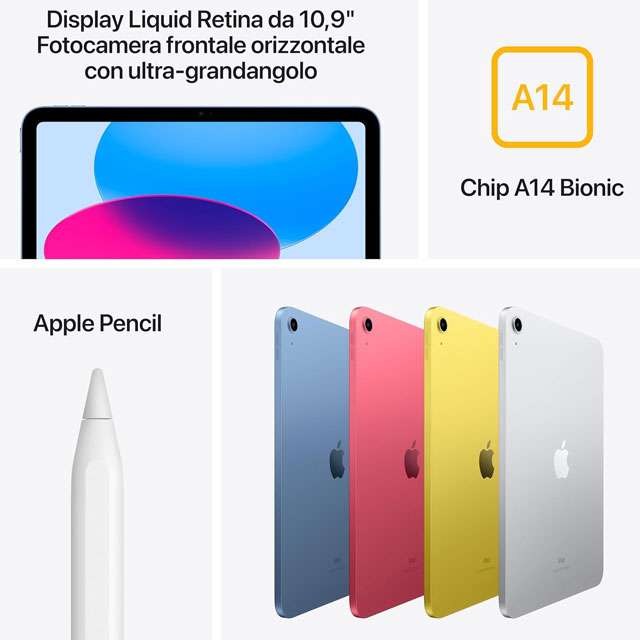 Animato dal chip A14 Bionic progettato internamente dalla mela morsicata con CPU 6-core e GPU 4-core, integra il display Liquid Retina in alta risoluzione, il supporto per Apple Pencil (acquistabile separatamente) così da poter scrivere, disegnare e prendere appunti a mano libera, una fotocamera posteriore da 12 megapixel, quella frontale con la stessa risoluzione, la tecnologia Touch ID per il riconoscimento biometrico e la connettività Wi-Fi 6 per l’accesso a Internet veloce. La ricarica della batteria avviene tramite porta USB-C. Trovi tutte le altre informazioni che cerchi nella descrizione completa.