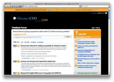 È il caso di ObamaCTO.gov , che punta a definire una roadmap ideale da far seguire al CTO – e dunque al presidente Obama – secondo l’opinione dei navigatori. Neutralità della rete, patriot act, DMCA, energie alternative, banda larga : al momento sono questi i temi più scottanti secondo l’opinione dei visitatori del sito. Tra gli argomenti toccati figurano ovviamente anche il software libero, la comunicazione trasparente tra cittadino e istituzioni, la ricerca scientifica e persino temi molto tecnici come IPv6: il meccanismo, che ricorda quello di Digg , non è certo perfetto (basta poco per sovvertire la classifica), ma è senz’altro un’indicazione utile a misurare il polso dell’opinione pubblica in materia di tecnologia.