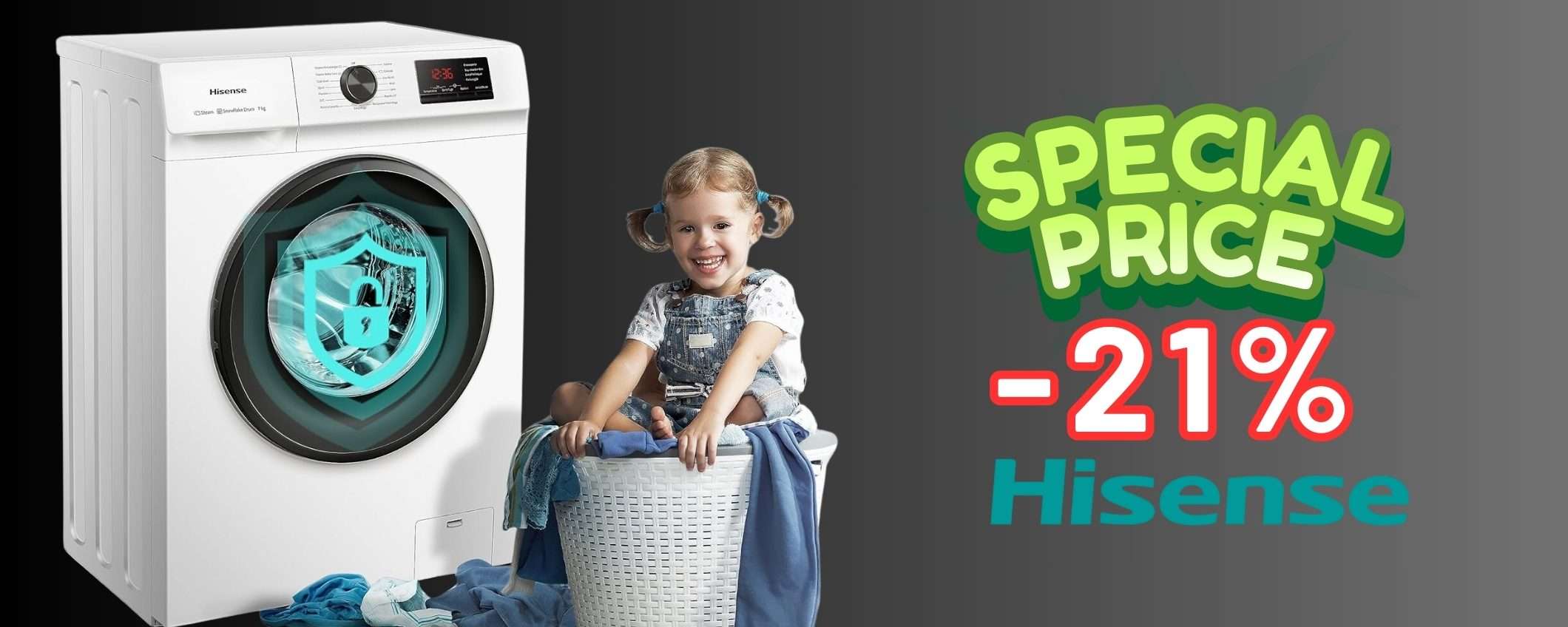 Se ti serve una lavatrice nuova, non sprecare questa occasione. Il modello WFVB7012EM di Hisense da 7 kg con carica frontale e centrifuga da 1200 rpm è in promozione. Prezzo piccolissimo per un dispositivo con 15 programmi preimpostati e funzione vapore al suo interno. Proprio su Amazon lo sconto del 21% che te la fa portare a casa a soli 269 euro con un click. Collegati e aggiungila al tuo carrello.