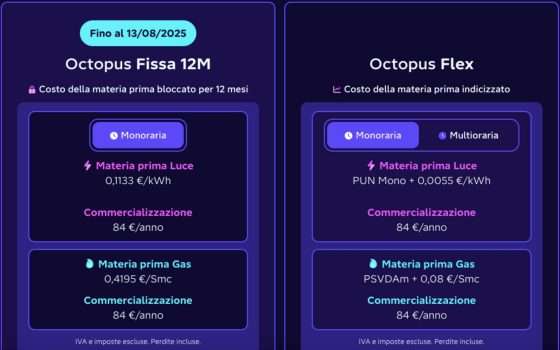 Octopus Energy propone due offerte pensate per soddisfare le esigenze di chi cerca chiarezza, trasparenza e sostenibilità. Entrambe garantiscono luce 100% rinnovabile, assenza di vincoli e si possono attivare fino al 13 agosto 2025.