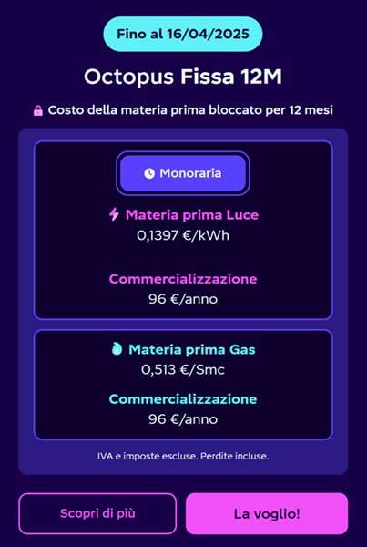 Le tariffe luce e gas dell’offerta a prezzo fisso Octopus valide fino al 16 aprile