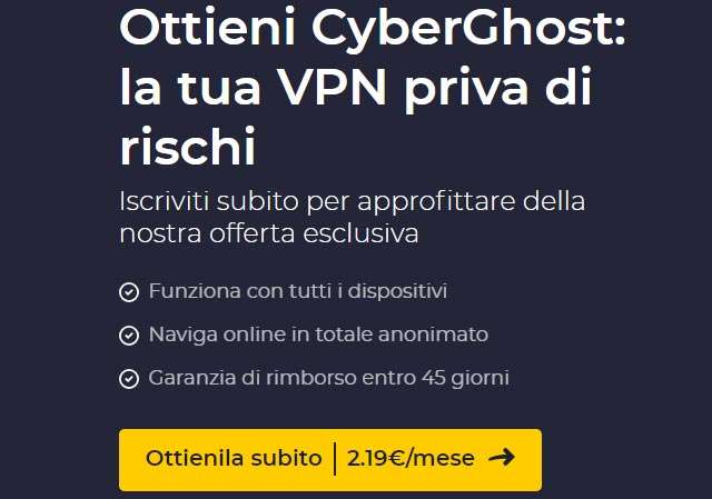 Molte VPN sono affidabili e convenienti sulla carta, mentre Cyberghost lo è realmente. Adesso, il servizio conviene maggiormente grazie all’offerta con possibile rimborso. Il costo è infatti di soli 2,19€/mese, dovuto allo sconto dell’82%. Con questa promozione a prezzo vantaggioso, ti assicuri una VPN di alto livello per i tuoi dispositivi. Nessuna minaccia online potrà mai intaccare la tua privacy. Il vero vantaggio è il possibile rimborso entro 45 giorni dall’acquisto, nel caso in cui il servizio non ti soddisfa.