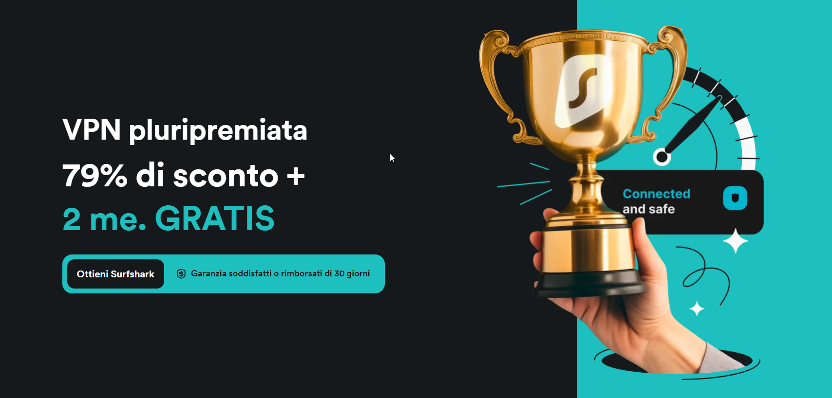 Ci sono tanti provider VPN in circolazioni, ma non tutti offrono il miglior rapporto qualità/prezzo. Se vuoi andare sul sicuro, punta direttamente a Surfshark VPN. Attualmente è in corso una promo speciale: 79% di sconto + 2 mesi extra di servizio gratuiti.