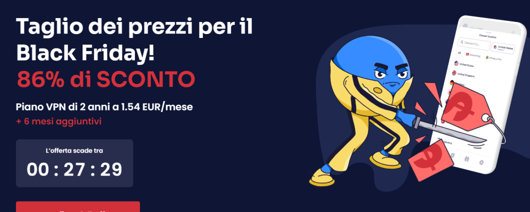 Non c’è momento migliore del Black Friday per abbonarsi alla VPN, con uno sconto dell’86%. Proteggi la tua vita online al prezzo super conveniente di appena 2 euro al mese e accedi a streaming senza interruzioni e velocità straordinarie!
