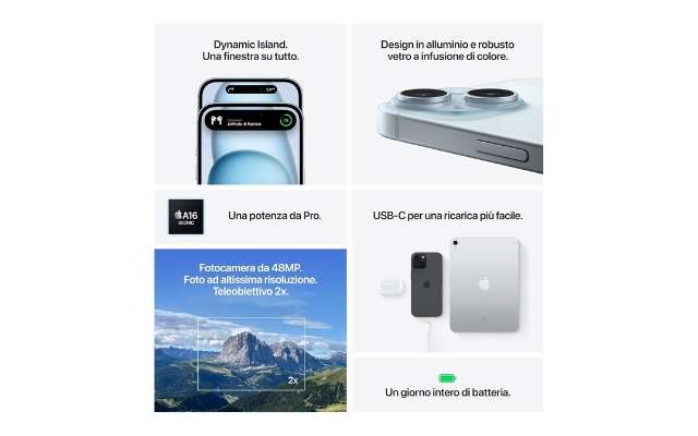 Apple iPhone 15 128GB è uno smartphone speciale che ti rivoluzionerà la vita. Essendo in grado di rilevare i suoi e i rumori che ti circondano, ad esempio può avvisarti che qualcuno ha suonato il campanello. Finalmente, Dynamic Island è su tutti i modelli e non solo sulle versioni Pro degli iPhone! Il chip A16 Bionic è una bomba in quanto a potenza e velocità nella gestione di app, giochi e funzionalità. Tutto coronato da un display con tecnologia Super Retina XDR davvero immersivo.