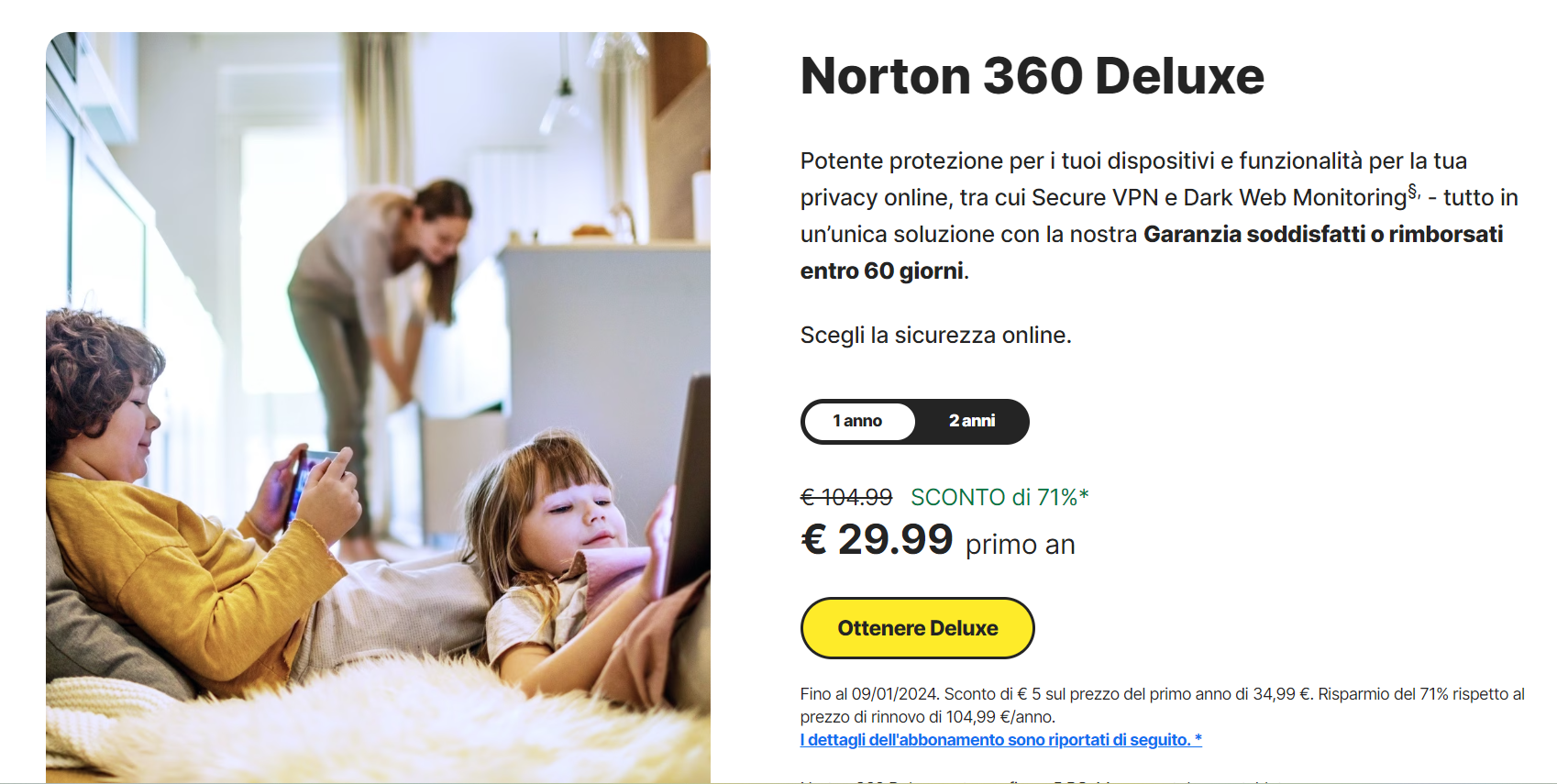 Norton, azienda di punta nel settore della sicurezza informativa, presenta una nuova offerta a tempo limitato sui piani antivirus Norton 360, con particolare menzione al 71% di sconto sulla versione Deluxe. Questo pacchetto, ora disponibile al prezzo record di 29,99 euro per il primo anno, consente di risparmiare 75 euro sul prezzo di listino.