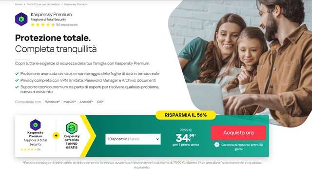 In una società connessa 24 ore al giorno, un normale antivirus non è più sufficiente. E nemmeno una VPN può fare più tanto di fronte a minacce più complesse di quella appena citata. Ecco quindi che in soccorso arrivano le prime soluzioni all-in-one, che riescono a coniugare un ottimo antivirus a una VPN premium. Una delle migliori soluzioni è Kaspersky Premium, che garantisce una copertura completa per tutte le esigenze di sicurezza della famiglia. In queste ore è possibile risparmiare il 56% sul prezzo di listino, con prezzi da 34,99 euro per il primo anno invece di 79,99 euro. In più, se le aspettative non dovessero essere all’altezza, si può sempre richiedere il rimborso completo entro 30 giorni dall’acquisto.