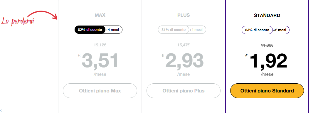 Se vuoi ulteriormente risparmiare, il piano Standard ha un costo di 1,92 euro al mese, con 2 mesi gratis. Ovviamente, il più completo è il piano MAX. Sta a te decidere a quale abbonarti.