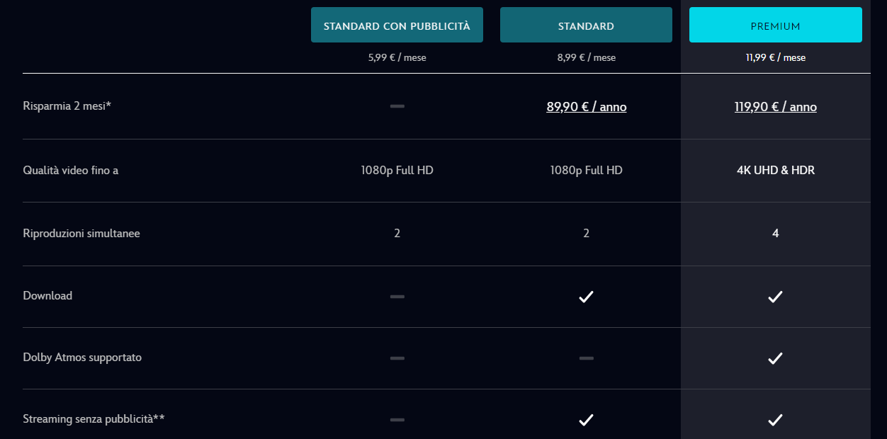 - Il Piano Standard con pubblicità è disponibile a soli 5,99 €/mese.