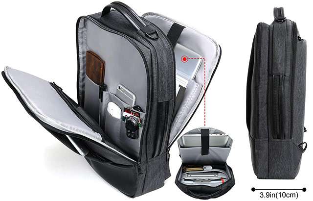 Lo scomparto per il portatile è dotato di una custodia imbottita con schiuma isolante anticollisione che tiene il dispositivo al sicuro dagli urti. Ci sono poi ben altre otto tasche interne e una esterna più facilmente accessibile in cui mettere tutto ciò di cui si ha bisogno: dal blocco per gli appunti alle chiavi, dallo smartphone a un libro, dagli occhiali al caricatore della batteria.