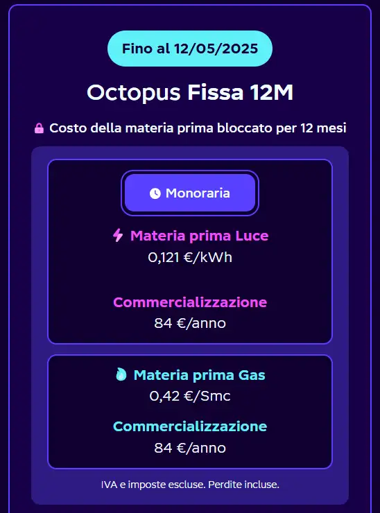 Se preferisci stabilità e prevedibilità nelle tue bollette, l’opzione Octopus Fissa 12M è pensata per te. Con questa tariffa: