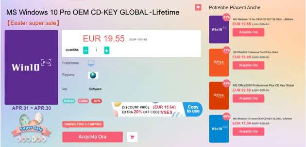 - Windows 10 PRO + Office 2019 Pro Plus Keys Lifetime a 48.58 Euro dopo il 30% di sconto con coupon (VIPPF)