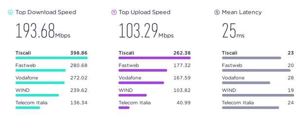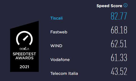 Il nuovo “Ookla Speedtest Awards 2021” è di Tiscali con 82,77 punti rispetto a Fastweb (68,18), con Wind (62,51), Vodafone (61,33) e Telecom Italia (43,52) a seguire. Per Tiscali i test hanno indicato una velocità in download pari a 398,86 Mbps e di 262,38 Mbps in upload. Il tutto è certificato dalla trasparenza della metodologia adottata da Ookla nei propri test, elemento primo a riprova dell’affidabilità delle misurazioni apportate. “Gli Speedtest Awards, presentati da Ookla, sono riservati a una ristretta selezione di operatori di rete che hanno fornito prestazioni e copertura internet eccezionali all’interno di un mercato“, ha spiegato Doug Suttles, CEO Ookla. E continua: “È un piacere per noi consegnare a Tiscali il premio per la Rete Fissa più veloce in Italia. Questo riconoscimento testimonia la loro eccezionale performance nel primo semestre 2021, sulla base delle rigorose analisi di Ookla dei test effettuati dai consumatori con Speedtest“.