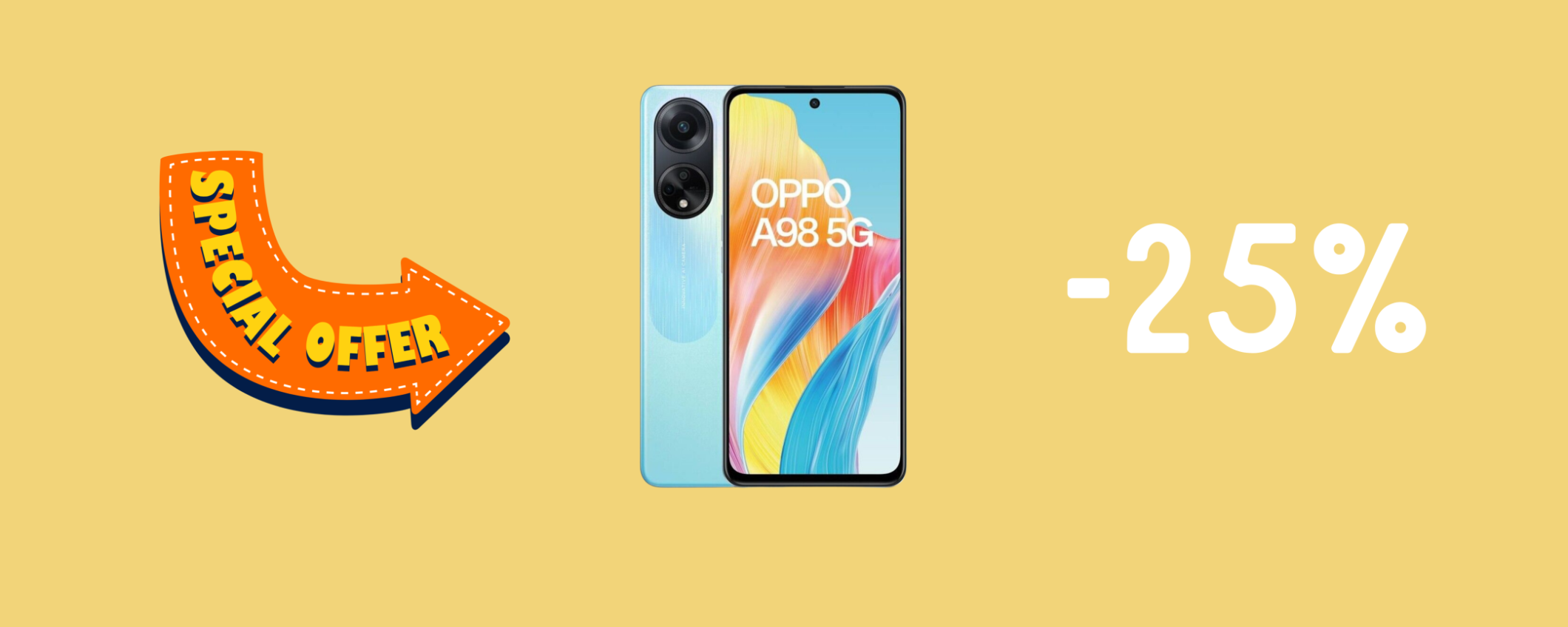 Tra i tanti smartphone di fascia medio-bassa presenti sul mercato, l’OPPO A98 5G si distingue come un’ottima scelta grazie ad una super offerta attiva ancora per poco su eBay. Oggi infatti, con uno sconto del 25%, questo smartphone è disponibile a soli 247,90€ su eBay. Questa è un’ottima occasione per risparmiare ben 82€ su uno smartphone con molta memoria ed ampio display.