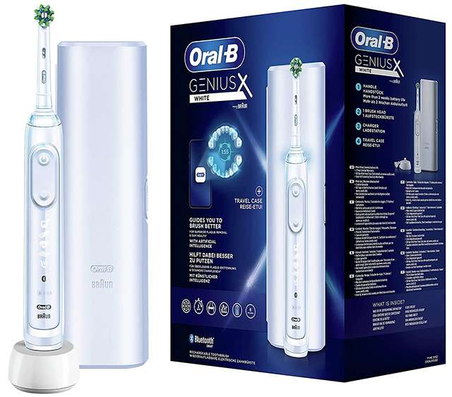 C’è poi Genius X, di cui abbiamo accennato in apertura il sistema IA in dotazione. In questo caso lo sconto è al 38% sul listino. Si può scegliere tra ben sei modalità di spazzolamento (Quotidiana, Pro-Clean, Denti Sensibili, Sbiancante, Protezione Gengive, Nettalingua) e nella confezione si trova la custodia da viaggio che lo rende comodo da portare ovunque con sé.