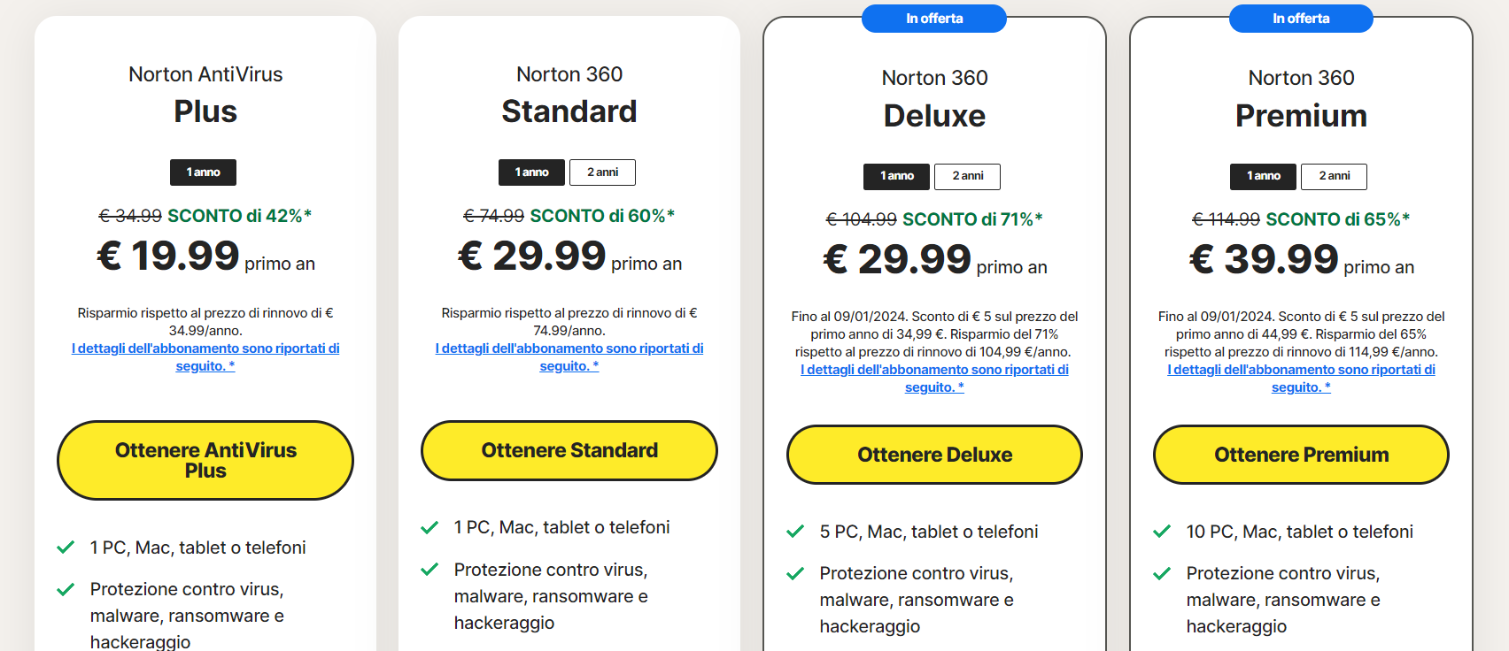Grazie a questa promozione eccezionale, proteggere i tuoi dispositivi con Norton diventa più conveniente che mai, offrendoti un risparmio significativo sull’abbonamento che meglio si adatta alle tue esigenze di sicurezza online.