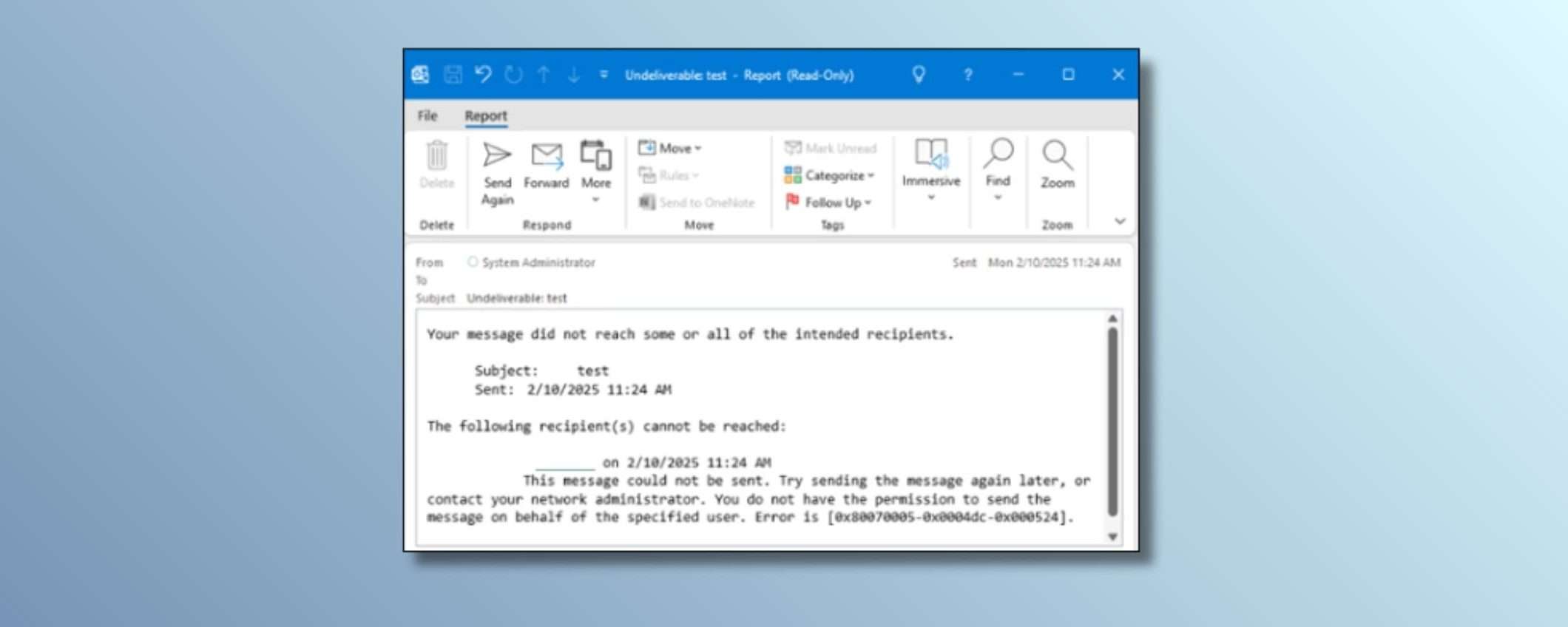 Il problema colpisce chi ha un account Outlook.com configurato nello stesso profilo Outlook insieme a un account Exchange (Microsoft 365). Quando si tenta di inviare un’email dall’account Outlook.com, appare un errore di mancata consegna (NDR) con il codice 0x80070005-0x0004dc-0x000524. L’email non parte.