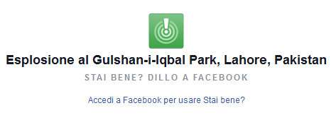 Molti degli utenti del social network hanno probabilmente appreso dell’attentato in Pakistan proprio attraverso la richiesta del sistema Safety Check , che a partire dal 2014 Facebook ha messo a disposizione per agevolare la gestione delle emergenze, da innescare nel caso di crisi, quando le comunicazioni si complicano e diventano indispensabili per tranquillizzare i propri cari.