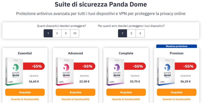 L’offerta consente di scegliere tra diversi livelli di protezione, pensati sia per utenti privati sia per famiglie, con strumenti che vanno oltre il semplice antivirus. Andiamo a scoprire nel dettaglio prezzi e caratteristiche dei vari piani di Panda.