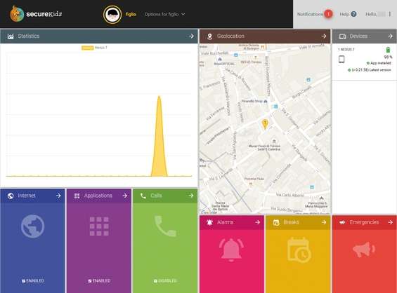 Con Applications , invece, possiamo scegliere quali applicazioni potrà usare. Attraverso la dashboard possiamo pertanto controllare a distanza tutte le attività del ragazzo, le statistiche sull’uso che viene fatto del dispositivo e osservare in tempo reale la posizione geografica in cui si trova.
