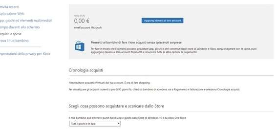 Diversi contenuti presenti sul Windows Store sono a pagamento. Per consentire al bambino di acquistarli, dobbiamo concedergli un po’ di credito. Per farlo, da Acquisti e spese clicchiamo Aggiungi denaro al tuo account Microsoft e seguiamo le istruzioni per scegliere l’importo. Da qui è possibile controllare anche lo storico degli acquisti.