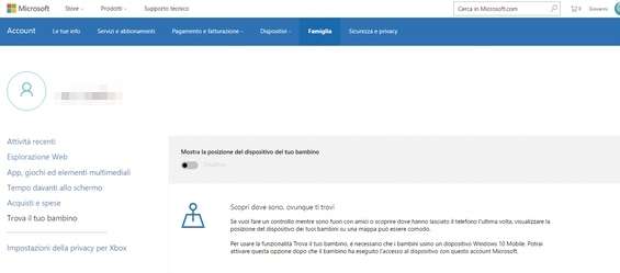 Se il bambino è uscito con gli amici e usa un dispositivo Windows 10 Mobile è possibile controllare dove si trova per stare più tranquilli. Basta loggarsi sempre sul sito Microsoft dedicato alla famiglia , cliccare su Trova il tuo bambino e mettere su Attiva l’opzione Mostra la posizione del dispositivo del tuo bambino .