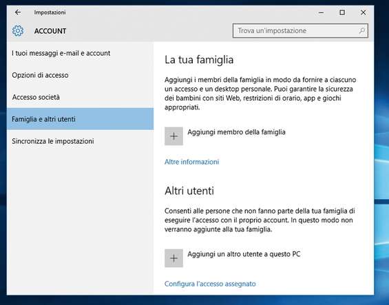 Oltre ai membri della famiglia, Windows 10 consente di creare utenti standard a cui dare l’ Accesso assegnato , un’impostazione che li limita ad usare solo determinate app del Windows Store. Per farlo si deve innanzitutto accedere al PC con un account amministratore e aggiungere un altro utente. Andare quindi in Impostazioni/Account/Famiglia e altri utenti e cliccare su Configura l’accesso assegnato per scegliere l’utente e l’applicazione che può utilizzare.