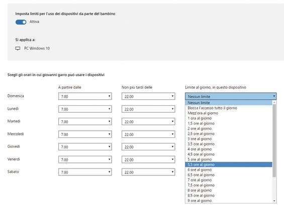 Ora sarà possibile impostare per ogni giorno della settimana gli orari in cui il bambino potrà usare i dispositivi. Dal menu a tendina Limite al giorno, in questo dispositivo è poi possibile specificare il numero di ore totali. Selezioniamo Illimitato se non vogliamo impostare un tempo massimo.