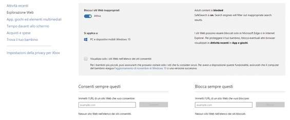 Clicchiamo sul pulsante Esplorazione Web e impostiamo su Attivato l’opzione Blocca siti Web inappropriati . Mediante questa opzione possiamo bloccare tutti i contenuti per adulti e allo stesso tempo attiviamo la ricerca sicura che filtra i risultati del motore di ricerca eliminando i link a contenuti non appropriati.