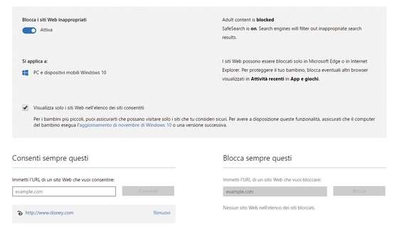 Nella parte bassa della schermata possiamo specificare i siti che potranno essere visualizzati e quelli che invece dovranno essere bloccati sempre. Spuntando poi la voce Visualizza solo siti Web nell’elenco dei consentiti facciamo in modo che il bambino possa visualizzare solo i siti Web consentiti in modo esplicito.