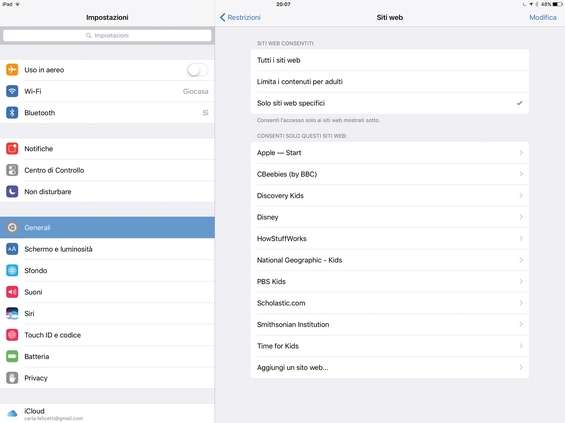 Per evitare che il bambino navighi su siti Internet in cui siano presenti contenuti violenti o non adatti alla sua età, possiamo applicare un filtro a Safari. Basta andare in Impostazioni/Generali/Restrizioni/Siti Web e selezionare l’opzione Limita i contenuti per adulti .