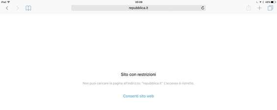 Provando a navigare su un sito non consentito in base alle restrizioni che abbiamo impostato, viene mostrata una pagina vuota con indicato che si tratta di un Sito con restrizioni . Per abilitarne la navigazione tocchiamo Consenti sito Web e immettiamo la password impostata per le restrizioni.