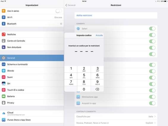 Si apre una piccola finestra che ci chiede di inserire un codice per le restrizioni. Inseriamolo due volte per abilitarle. Facciamo in modo di non dimenticarlo perché sarà necessario tutte le volte che vorremo modificare le impostazioni.