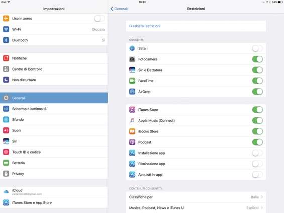 Per impostazione predefinita le restrizioni sono disabilitate. Per attivarle e configurarle andiamo in Impostazioni/Generali , tocchiamo l’opzione Restrizioni e poi la voce Abilita restrizioni mostrata in alto. La procedura è indifferente su iPad e iPhone.