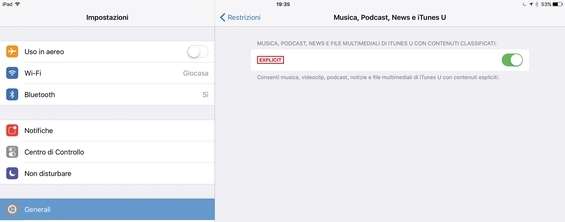 Spostiamoci in Contenuti consentiti e tocchiamo Musica, Podcast, News e iTunes U . Da qui disabilitiamo l’opzione Espliciti in modo che il bambino non possa accedere ai contenuti inadatti presenti su iTunes. Non è difficile imbattersi in canzoni che inneggiano alla violenza.