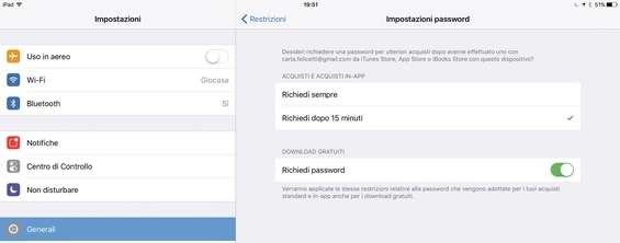 Per impedire al bambino di scaricare app e fare acquisti possiamo sfruttare anche la password del nostro Apple ID. Da Impostazioni password selezioniamo Richiedi sempre e abilitiamo Richiedi password per inserire la chiave di accesso ogni volta che si proverà a scaricare un contenuto.