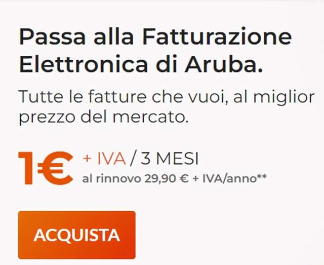 Puoi passare alla Fatturazione Elettronica di Aruba collegandoti a questa pagina. Nell’ambito della promozione in corso, il costo per i primi 3 mesi è fissato a 1 euro.
