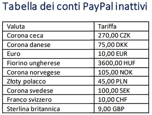 Se il conto PayPal dell’utente resta inattivo per almeno dodici mesi consecutivi, potremmo addebitare all’utente una tariffa annuale di servizio per inattività. Inattivo significa che l’utente non ha effettuato l’accesso al proprio conto PayPal o che non ha altrimenti usato il proprio conto per inviare, ricevere o trasferire denaro.