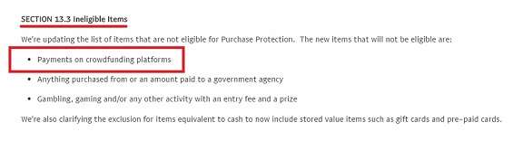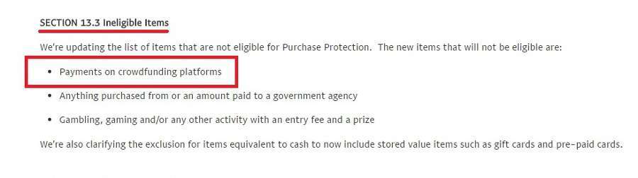 PayPal, nell’aggiornamento delle proprie policy, ritiene invece che i rischi connessi al finanziamento delle startup e dei progetti promossi nelle piattaforme di crowdfunding siano simili a quelli derivanti dal “gioco d’azzardo o di qualsiasi altra attività che prevede il pagamento di una quota in cambio di un premio”, situazioni nelle quali la protezione dell’acquisto non è prevista dalle nuove regole, così come per gli acquisti ed i pagamenti effettuati ad enti governativi. Il programma di protezione assicura da una parte i venditori, per pagamenti eseguiti da un account crackato, dall’altra i clienti, nel caso l’oggetto acquistato non giunga a destinazione o non corrisponda alla descrizione.