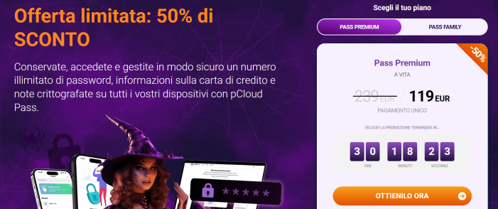 Il prodotto si chiama pCloud Pass, e ancora per poche ore è in sconto del 50% al prezzo di 119€ invece di 239€ per un singolo account (Pass Premium) oppure 199€ invece di 399€ fino a 5 utenti (Pass Family). Andiamo a scoprire più nel dettaglio cosa offre.