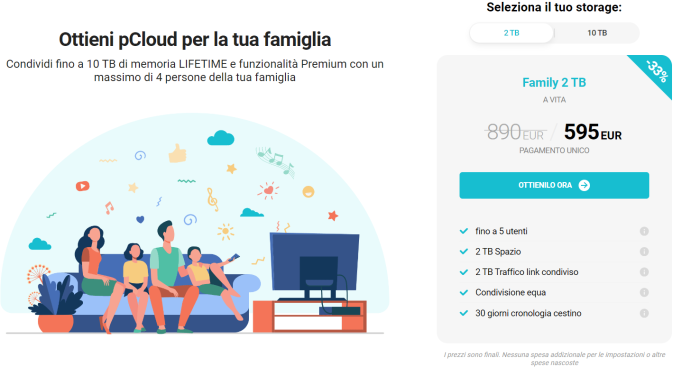 In questo momento il piano pCloud Family a vita da 2 TB viene venduto al prezzo di 595€ una tantum anzichè 890€. Per tutti i dettagli clicca qui.